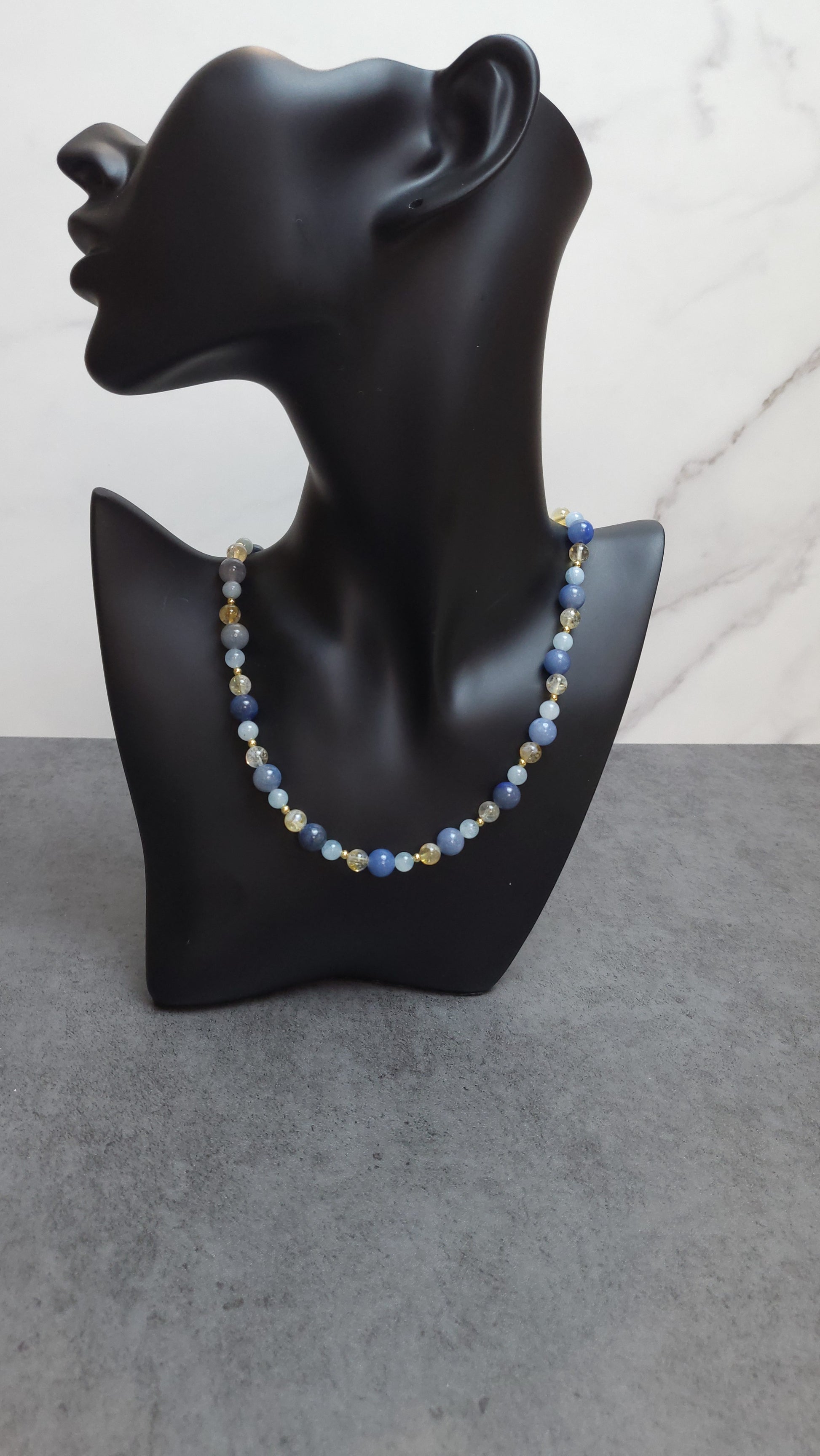 Embrace the calming beauty of a desert sunset with the Desert Twilight Necklace, a handcrafted design that blends warm and cool gemstone hues with effortless sophistication. This handmade gemstone necklace features shimmering 14k gold-filled beads, paired with vibrant citrine, soft chalcedony, and deep blue aventurine to create an eye-catching palette inspired by the twilight sky over the desert.