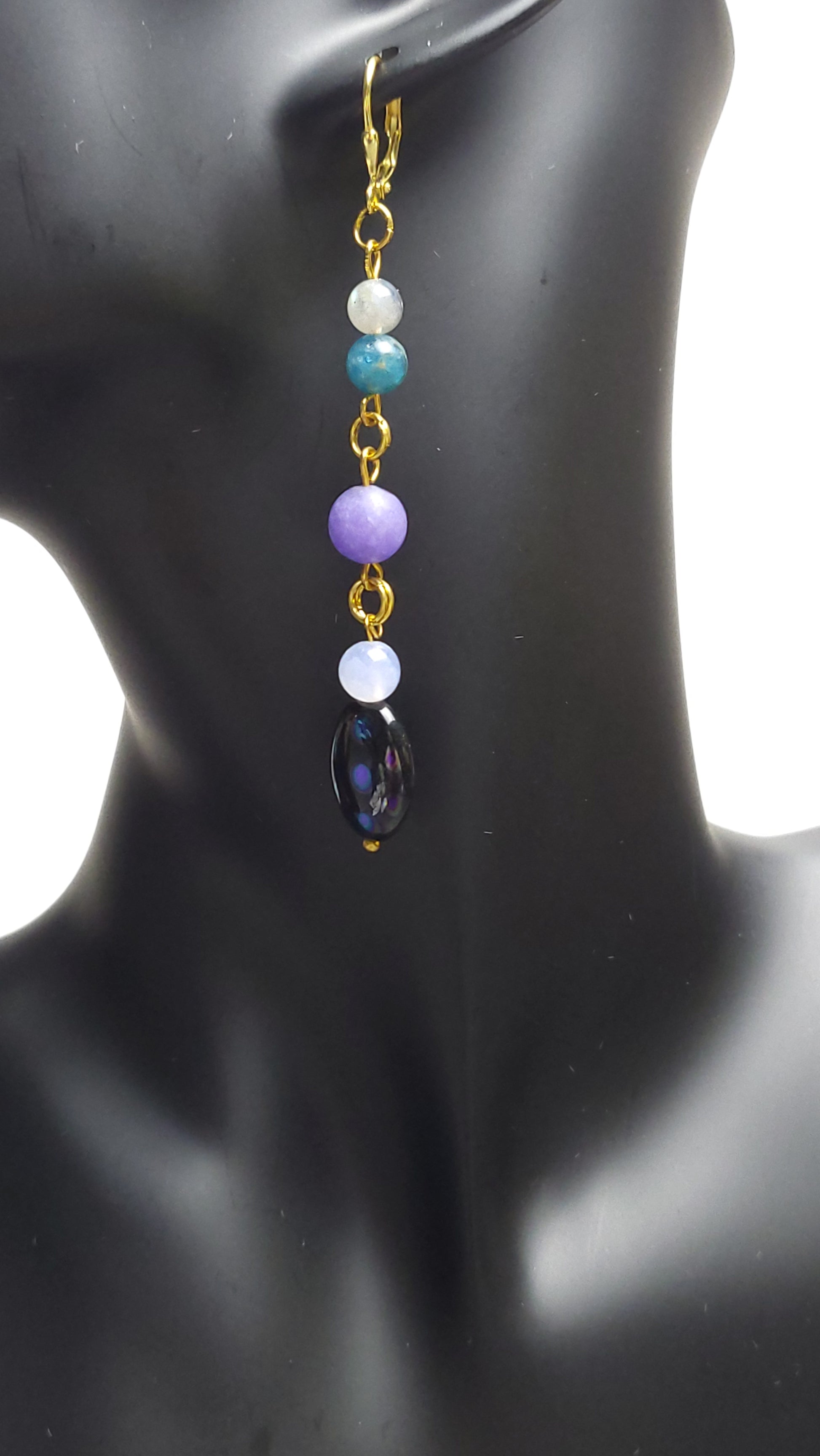 Step into the spotlight with these vibrant Disco Night earrings! Featuring bold gold hoops, these statement pieces are adorned with a dazzling mix of gemstones. The striking apatite brings a pop of color, while the rich purple matte jade adds a touch of sophistication. Iridescent labradorite catches the light beautifully, and the smooth chalcedony introduces a calming balance. Complemented by Czech black beads adorned with iridescent spots, these earrings capture the essence of a lively night out. Perfect for dancing the night away or elevating any ensemble, these earrings are a must-have for your accessory collection!