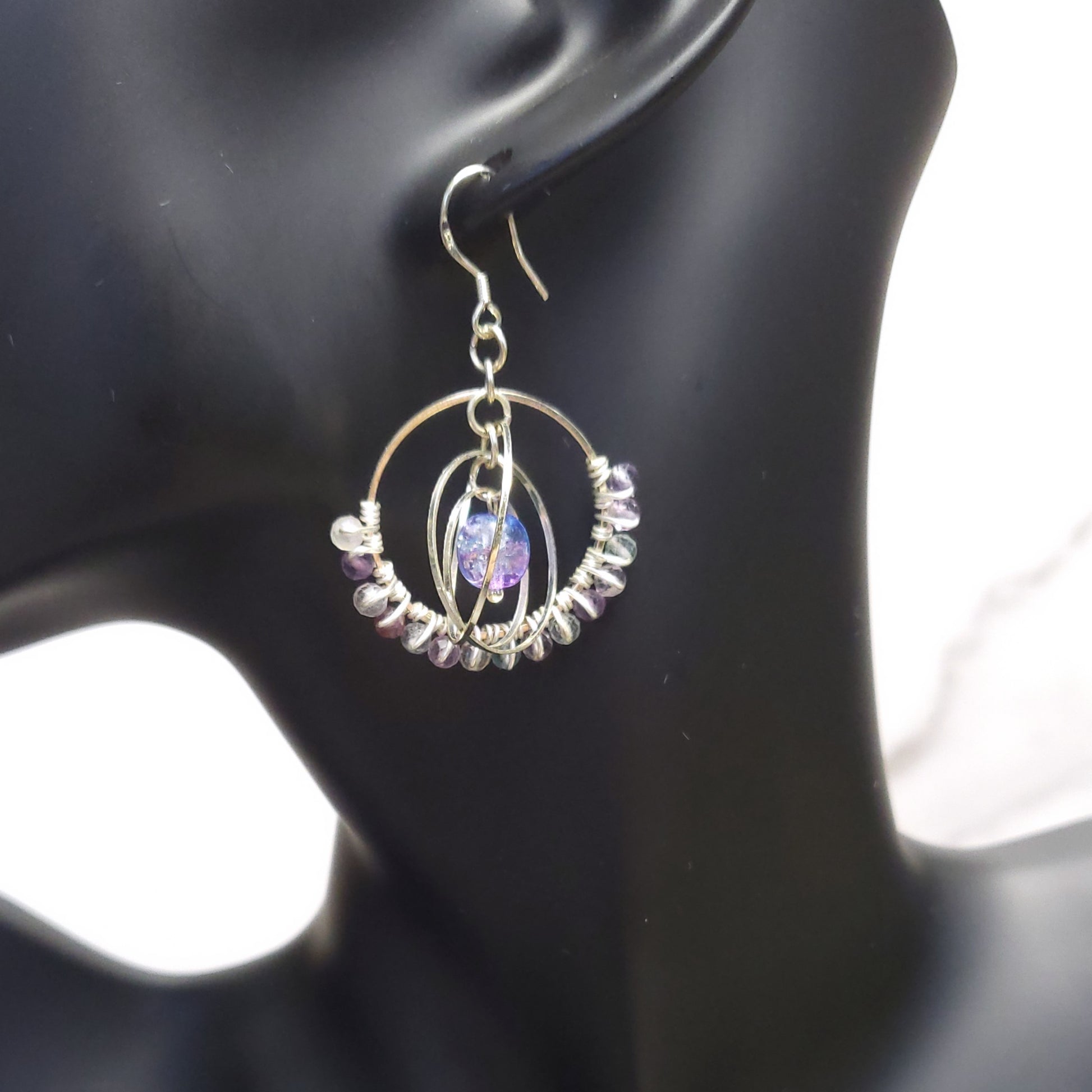 Escape beyond our planet with these earrings displaying sparkling Czech glass planets with orbiting fluorite. Meticulously hand shaped wire creates the illusion of movement and allows each fluorite strand to have its moment from all angles.