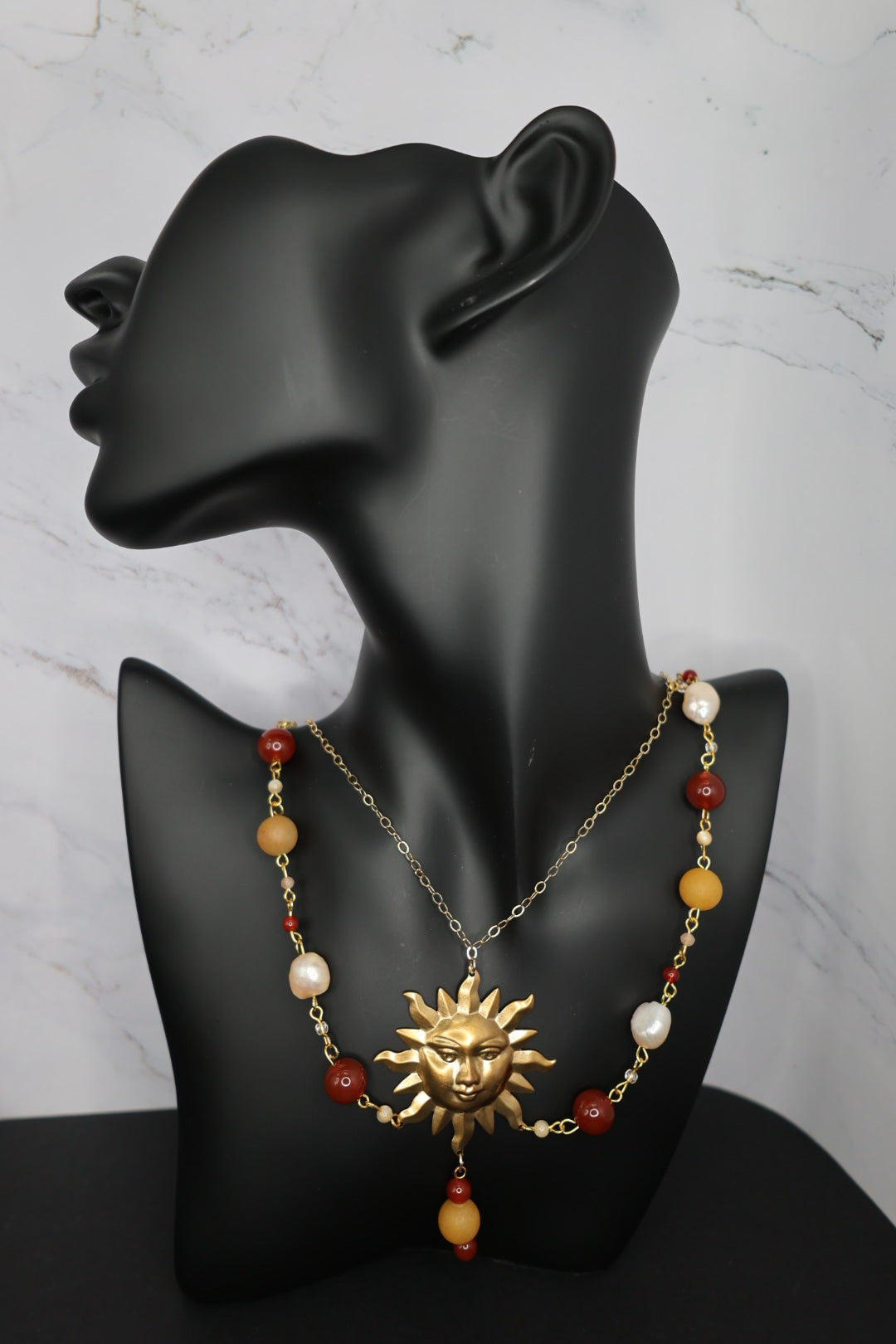 Shine bright and radiate positivity with this sun charm gold-filled necklace, designed to capture the vibrant warmth of a perfect sunny day. A radiant sun pendant is surrounded by a joyful mix of yellow jade, freshwater pearls, sunstone, carnelian, mother of pearl, and shimmering Czech glass beads — creating a colorful glow that feels uplifting and full of life.