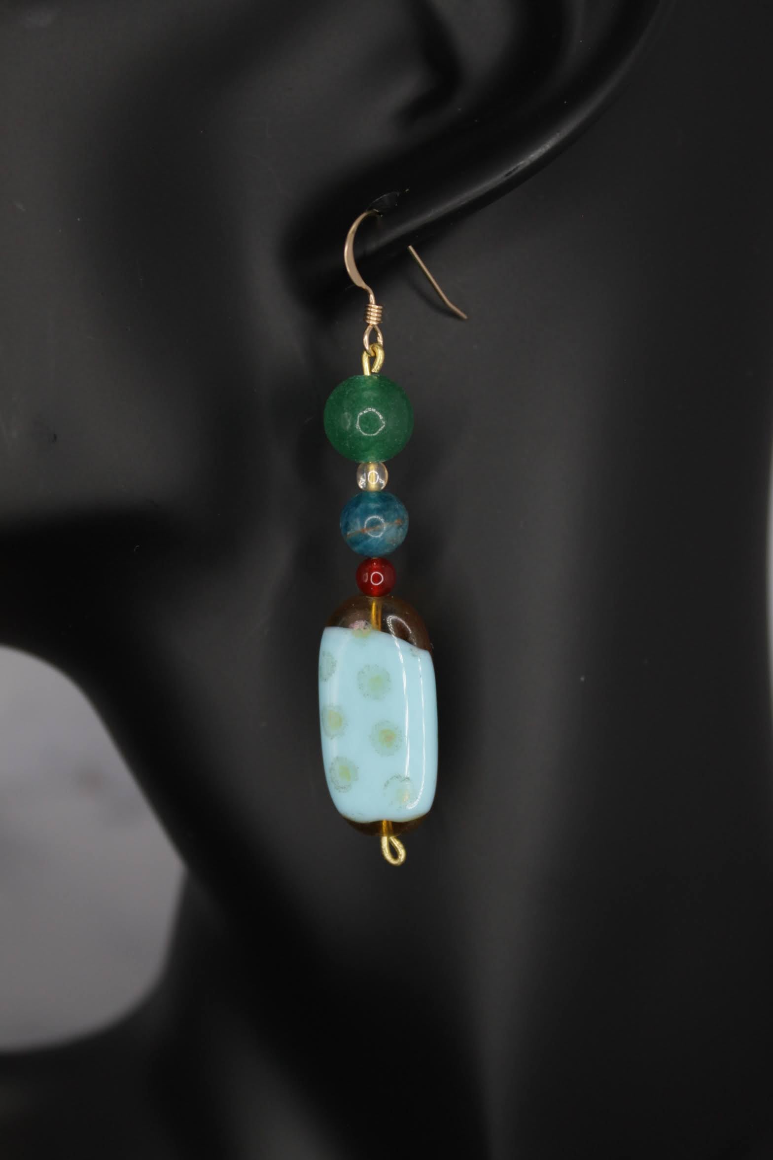 Get the attention from those around you with these unique 14k gold filled earrings that showcase an array of colors. Constructed with genuine green aventurine, apatite, carnelian, Czech glass and a vintage bead. You are sure to make a fun impression.