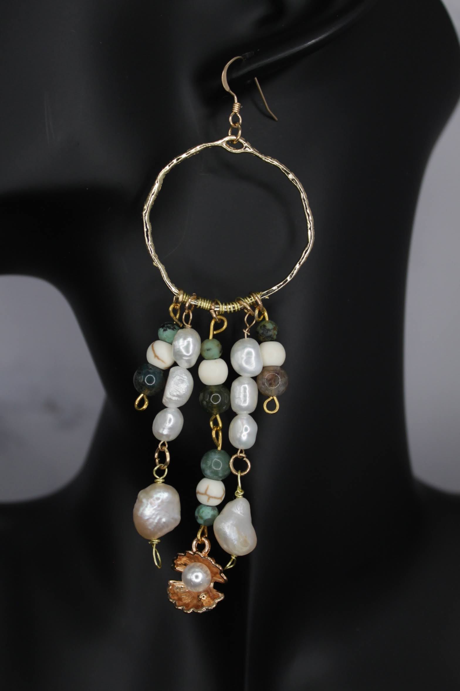 With mystical beauty and earthy tones these enchanting 14k gold filled earrings are made with extra love. Using African turquoise, howlite, Indian agate, mother of pearl, and freshwater pearls! Each earring has a clam charm with a pearl and are carefully hand wrapped with gold wire.