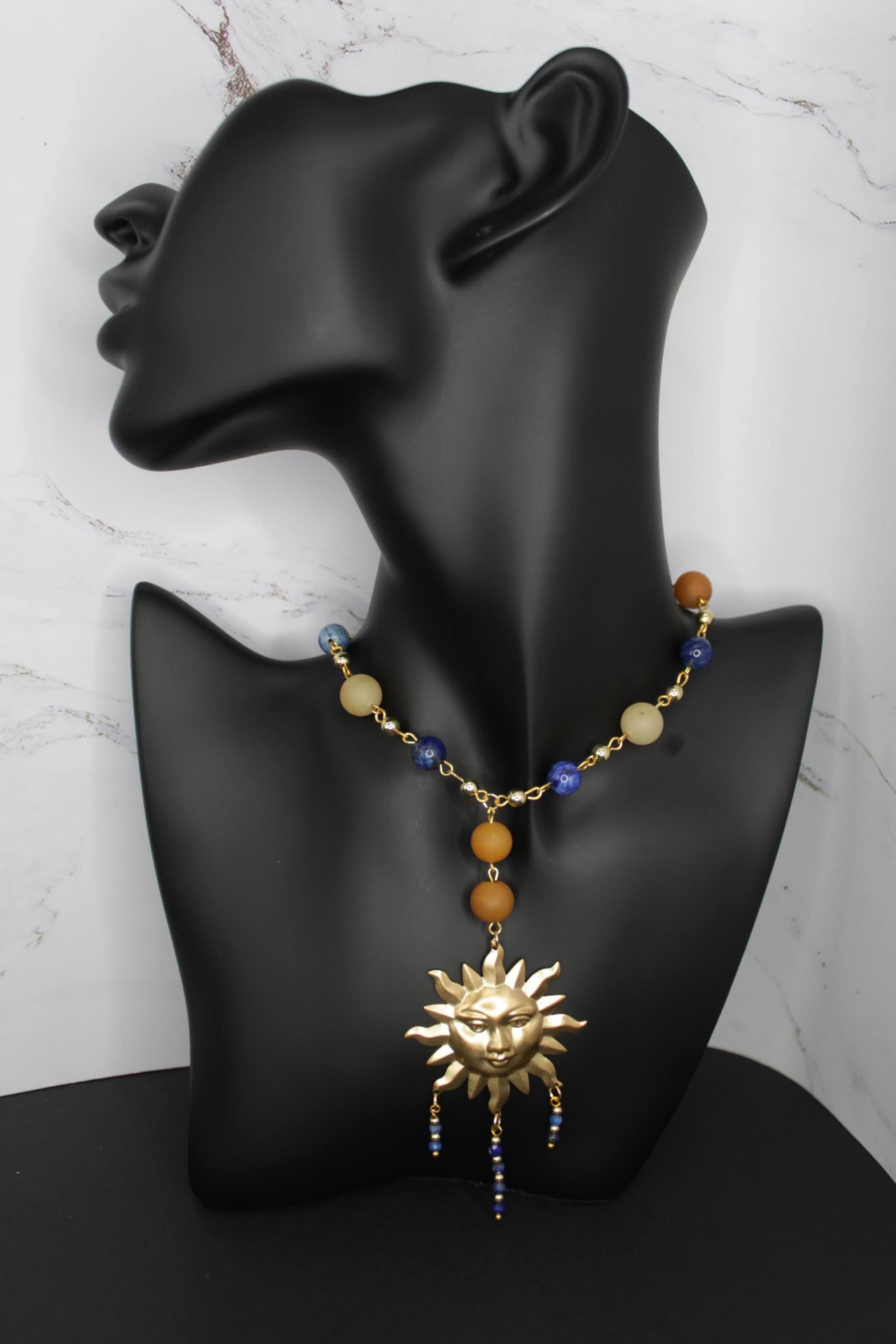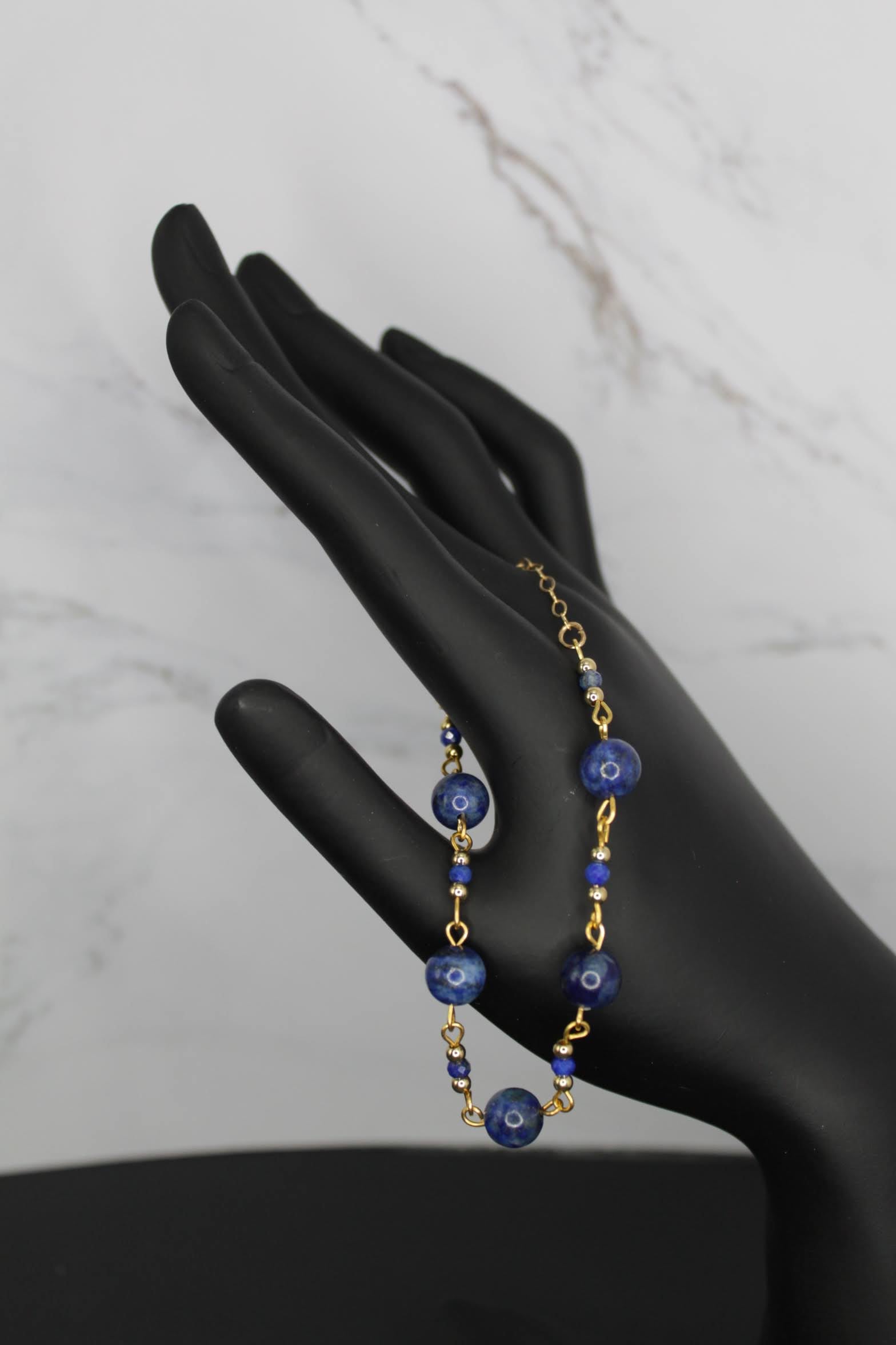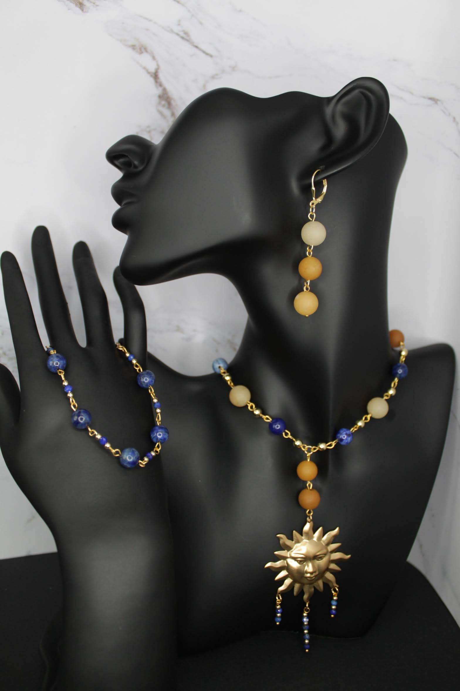 This collection consists of a necklace, bracelet and earrings made with 14k gold filled findings, lapis lazuli, yellow jade, and azurite.